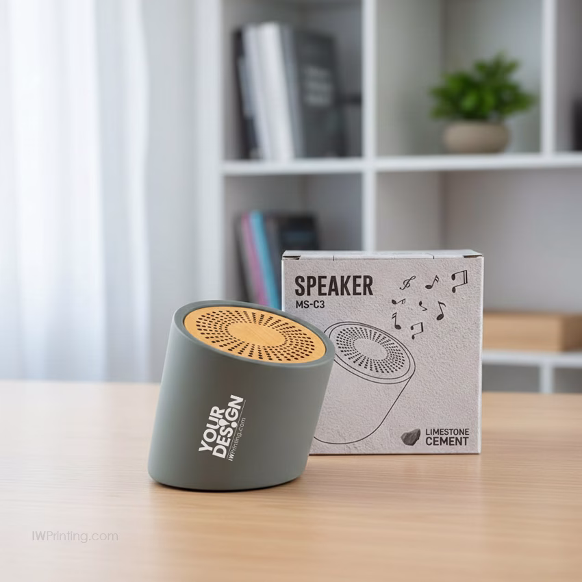 With Bluetooth 5.0 and up to 10 meters connection range, it offers smooth wireless performance. The built-in 500mAh battery provides around 4 hours of playback at 70% volume. Available in elegant grey and brown colors, this round speaker can be customized with your logo, making it a thoughtful and impressive corporate gift from IWPrinting.com.