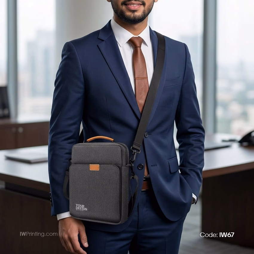 For branding, the bag features customizable print areas on PU leather patch and fabric, with options such as screen printing and DTF printing for a professional finish. Perfect for corporate giveaways, employee kits, and promotional campaigns in Dubai, this product is offered by IWPrinting, delivering quality and impactful brand visibility through everyday essentials.