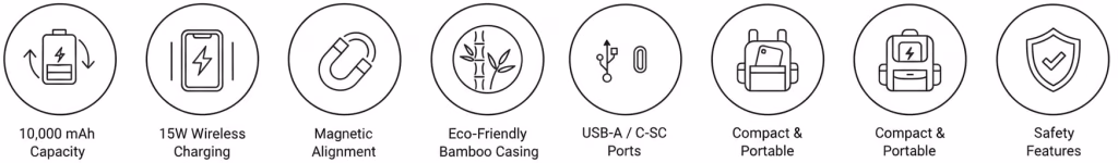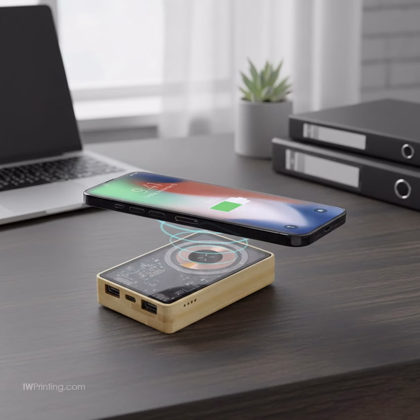 Magnetic Bamboo Fast Wireless Powerbank 10,000 mAh from IWPrinting.com combines sustainability with advanced charging technology. Designed with an eco-friendly bamboo casing, this stylish powerbank delivers 15W fast wireless charging and features MagSafe-compatible magnetic alignment for seamless use with iPhone 12/13/14/15 and other magnetic-supported devices. It also includes USB-A and USB-C ports for convenient wired charging options.