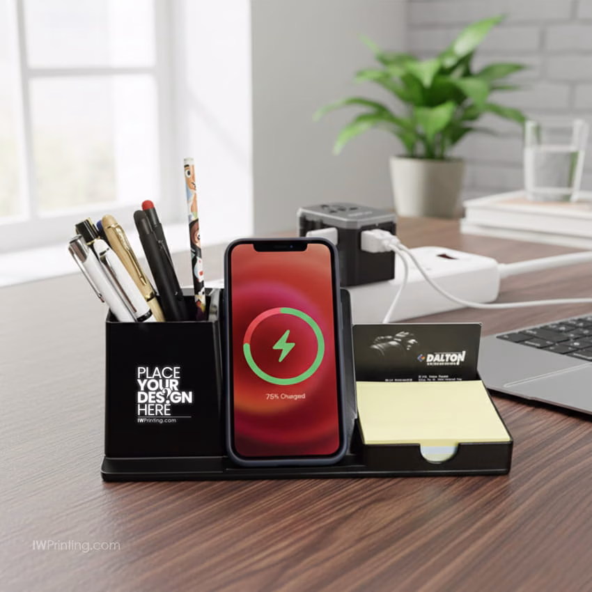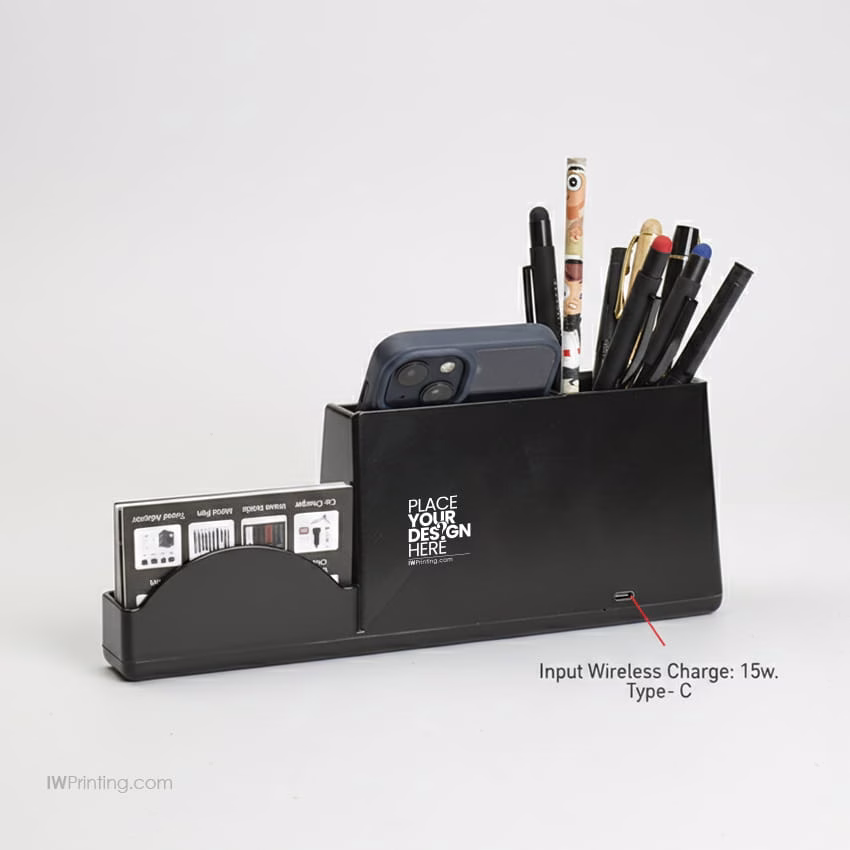 Multi-Purpose Charging Organizer is a practical and modern desk accessory designed to keep devices powered and essentials neatly organized. It supports multiple input options (9V-2A, 5V-2A), USB output up to 5V-2A (Max), and fast 15W wireless charging, making it ideal for everyday office and home use. With a compact yet functional size of 255 × 97 × 94 mm, this organizer is perfect for desks, workstations, and bedside tables. It offers branding options such as engraving and screen printing, making it an excellent choice for corporate gifts, promotional giveaways, and executive merchandise from IWPrinting.