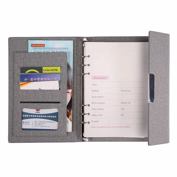 A5 size notebook, 4 card holder slots, 90 sheets 100g organizer, Additional pocket for documents, pen loop