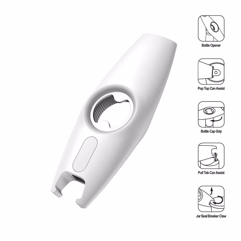 Handy kitchen or picnic accessory with 5-in-1 multi-functions that can help open different types of seals and caps in jars, bottles, cans, etc.