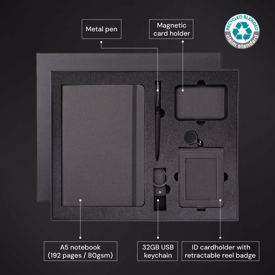 Sustainable Gift Set Printing in Dubai offers a smart and eco-conscious way to present your brand while supporting the environment. The CHANGE ZERO Gift Set includes five thoughtfully designed items: a color-matching A5 notebook (192 pages, 80 GSM), a metal pen, a 32GB USB keychain, an ID cardholder with retractable reel badge, and a magnetic card holder—all made from GRS-certified recycled PU material.