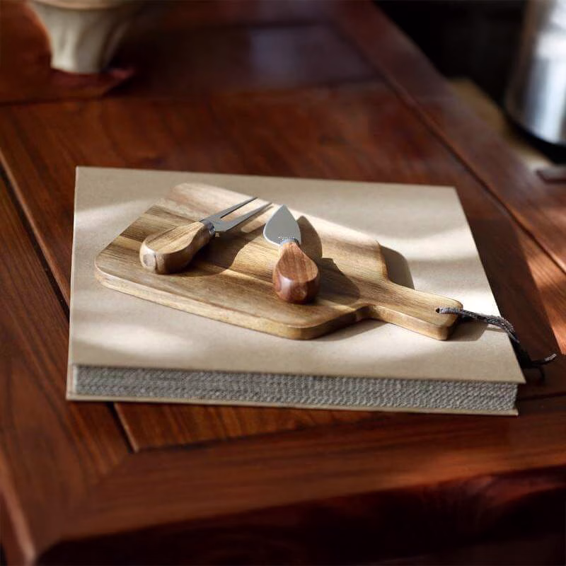 Crafted from high-quality acacia wood, this board offers durability, a rich natural finish, and a sophisticated look. It comes with 2 matching knives, making it a complete serving set for entertaining guests or special occasions.